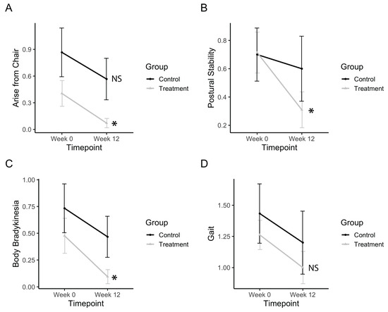 Bradykinesia, postural stability, and gross motor movements. (a) Change in UPDRS scores for arising from a chair. (b) Change in UPDRS scores for postural stability. (c) Change in UPDRS scores for body bradykinesia. (d) Change in UPDRS scores for gait. Data represents the mean, and error bars represent standard error. Asterisks indicate significant changes (p < 0.05), and NS indicates non-significant changes. Higher values in scores indicate greater disability.