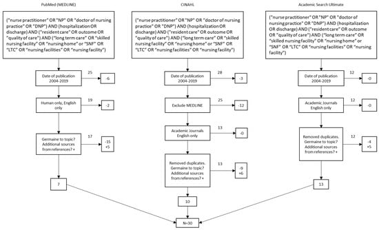 All authors individually reviewed the articles from the searches. Articles were eligible for inclusion if they were published by academic journals or universities between 1 January 2004 and 30 August 2019. The articles had to be published in the English language and pertaining to humans only. Articles had to explore nurse practitioners impacting hospital admissions or readmissions for patients in long-term care to be included in the systematic review.