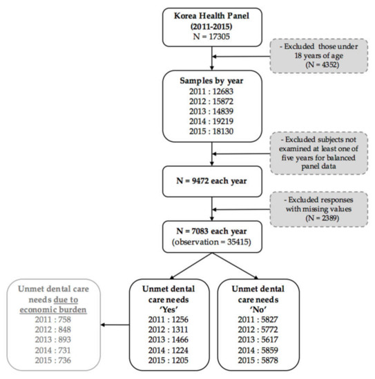 - Choi, J.W.; Choi, Y.; Lee, T.H.; Lee, H.J.; Ju, Y.J.; Park, E.C. Employment status and unmet dental care needs in South Korea: A population-based panel study. BMJ Open 2019, 9, e022436. [Google Scholar] [CrossRef] [PubMed]