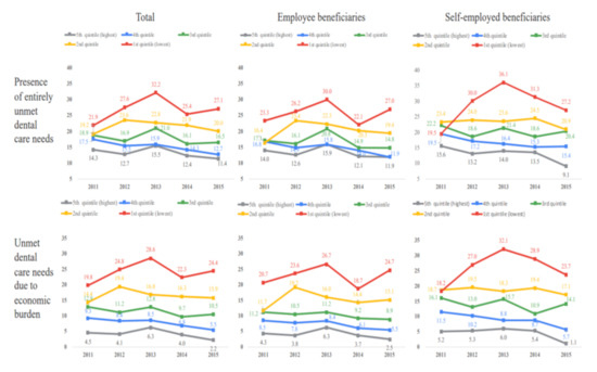 We conducted a trend analysis and panel logistic regression analyses, using weights to make the data nationally representative. All analyses were conducted in two groups by types of NHI beneficiaries (employees and self-employed) through stratification analysis. First, we conducted a trend analysis of unmet dental care needs by income quintile group and health insurance beneficiary from 2011 to 2015. Second, we performed a chi-squared test to describe the general characteristics of the study population and to check for differences between the types of NHI beneficiaries based on unmet dental care needs and the inability to receive necessary dental care owing to economic burdens. Third, we ran multiple panel logistic regressions to assess the independent association between unmet dental care needs and income level. We then applied two-panel logistic regression models with a fixed-effects approach. The fixed-effects logit model estimation focuses on within-individual comparisons across the five waves by controlling for unmeasured time-variant confounders. In model 1, we used health insurance type and income, as well as the effects on unmet dental care needs and the inability to receive necessary dental care owing to economic burdens. In model 2, we included covariates (i.e., gender, age, education level, employment status, health status, whether an individual had a chronic disease, and whether an individual had a disability) to explore the effect of income level on the odds ratio of the outcomes between employee and self-employed beneficiaries.