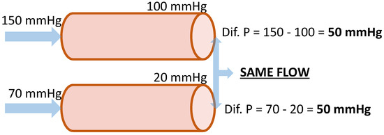 Blood flow begins in the aorta, the main artery with a diameter of approximately 2.5 cm. Blood, like any fluid, moves through the arteries driven by pressure differences, moving from the highest pressure zone (P1) to the lowest one (P2), depending on the gradient between both areas, i.e., the difference between the starting area and the final area (see Figure 2). The area that withstands the greatest pressure is the closest one to the heart, the aorta artery, and is the one with lowest number of capillaries. This dynamic causes blood movement and facilitates nutritional exchange in the capillary areas. In blood flow, vascular resistance (R) is worth considering, always moving in the opposite direction to movement. Its increase influences the development of ulcerative lesions in lower limbs, as it affects arterial flow rate (blood volume per time unit) [16]. Mathematically, it is defined through the Ohm’s equation: