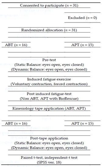 This study was designed as a single-blinded, randomized controlled trial. Participants were randomly assigned to either the control group (APT) or experimental group (ABT). All measurements were carried out by the same examiner, in a university laboratory, who was stationed behind a nontransparent screen and was blinded to group allocation. The order of measurement (eyes open, eyes closed, static, and dynamic) was randomized. The randomization process was carried out using a computer-generated table of random numbers. Taping was performed by a physical therapist with more than 10 years of experience. First, the static and dynamic balance of both groups were measured with eyes open and then with eyes closed, respectively. Immediately after the ankle muscle fatigue-inducing exercise, measurements of static and dynamic balance were measured again. ABT with kinesiology tape or APT was applied immediately and static and dynamic balance were measured for a third time. The flowchart of this study is shown in Figure 1.
