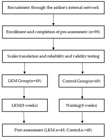 The present study involved 98 flight attendants (22 males, who accounted for 22.44% of the participants; M = 29.26, SD = 6.12) from Xiamen Airlines in China. All participants were aged 21–40 years old. Participants were randomly assigned into one of two groups: the LKM training group (49 participants) and the waiting control group (49 participants). The two groups were not significantly different in terms of demographic characteristics (Table 1).