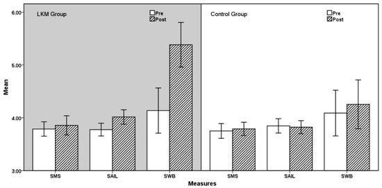 For SWB, there was a significant main effect of Time: F(1,96) = 24.407, p < 0.001 η2p = 0.203, and there was a significant main effect of Group Type, F(1,96) = 4.665 p = 0.033 η2p = 0.046, and there was also a significant interaction was found between Time and Group Type, F(1,96) = 14.285, p < 0.001, η2p = 0.130. Results indicated that LKM produced a significant increase in SWB score levels.