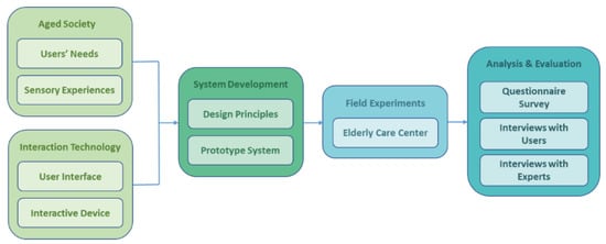 In this study, as shown in Figure 2, two major issues regarding older adults were investigated, namely, the aged society and interaction technology. Regarding the former issue, the users’ needs and their sensory experiences were collected at the beginning of this study; for the latter, literature reviews of existing studies on interactive devices and related user interfaces were conducted. The results were utilized to induce some design principles based on which a prototype interactive device with tangible interfaces for older adults was constructed. Also built on the proposed device was a game providing the three previously-mentioned functions for older adults, namely, nostalgia, leisure, and entertainment. Two field experiments were then conducted in an older people care center where 7 and 30 older adults were invited to play the game on the prototype device in the two experiments, respectively. The results of the interviews conducted in the first experiment about the participating older users’ feelings and sensory experiences of playing the proposed interactive game were used to improve the prototype device for use in the second experiment. Questionnaire surveys of the users’ comments and collections of opinions from interviews with several experts were conducted in the second experiment, followed by analyses of the data to prove their reliability and validity as well as evaluations of the data from various viewpoints to prove the effectiveness of the proposed device for the welfare of older adults from several aspects. The details of this research process will be described subsequently in the remainder of this paper.