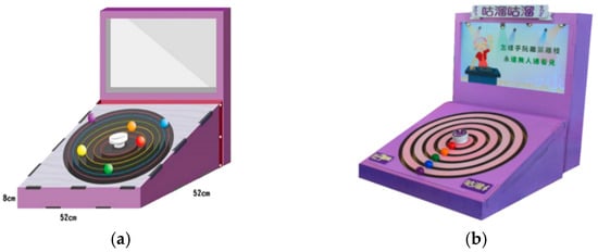 As shown in Figure 3b, the start button is located at the center of the tangible panel and surrounded by the five concentric slide rails, and the RFID reader is located at an ID sensing area at the bottom left corner of the panel. A user may tap his/her user ID card, which includes an RFID tag, against the ID sensing area to trigger the RFID reader to read the tag and press the start button to turn on the button switch to generate a game-triggering signal. The signal is then sent, via the Makey Makey board, to the computer to start the “Guliu Guliu” game. Also, the user’s ID data are sent, in the meantime, to the computer for further processing and keeping in storage. It is noted, by the way, that the Makey Makey board is an invention kit through which everyday objects may be connected to a computer program [53]. Afterwards, when the user rotates the colored ball on one of the concentric slide rails to pass a fixed spot on the rail, the corresponding reed switch is turned on to generate a signal for use by the game program on the computer for song selections. Specifically, as mentioned previously, a rotation of the ball along the rail for a complete circle will pass the fixed spot two times to complete the selection of a song.