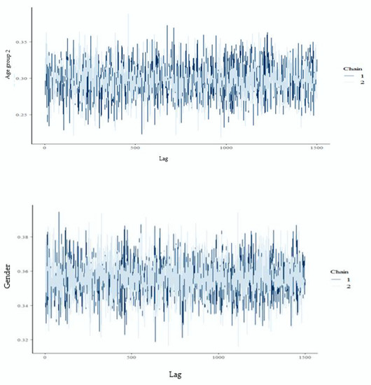 We then use HMC methods to sample from the posterior. As mentioned before, HMC uses NUTS, which is proposed to reduce the HMC dependency on its parameters and is more efficient than both the Gibbs sampler and the Metropolis–Hastings [23,47]. All estimations are conducted in R, RStudio, and Stan software [48,49,50]. Our HMC techniques involve two chains with a burn-in phase of 2500 to enable the Markov chains to forget their initial regions [27,29] with total iterations of 4000 per chain. We present convergence diagnostics to show that our MCMC chains converge to their target posterior distributions. Convergence diagnostics are shown in Figure 1. Since we have multiple independent variables, trace plots as convergence diagnostics for only two variables—gender and age group two—are shown in Figure 1. The trace plots for both variables indicate that MCMC chains exhibit good mixing, which suggests successful convergence. In Bayesian analysis, formal tests to check for convergence exist, and these include the Gelman–Rubin test [51], Geweke diagnostic [52], Raftery and Lewis [53], and many others. Thus, in addition to graphical methods, out of preference, we also apply the Gelman and Rubin test [51] to confirm convergence of the sequences. The Gelman–Rubin test checks whether parameter estimates are stationary, i.e., whether the Markov chains converged to their posterior distributions. The test compares the intra- and the inter-chain variation, and if the test statistic for all parameters is less than 1.10, then convergence is successful, otherwise, it is not [22,51,54]. The Gelman–Rubin test statistics are smaller than 1.004 for all parameters of the estimated models, which provides strong evidence of convergence—a result consistent with trace plots in Figure 1.