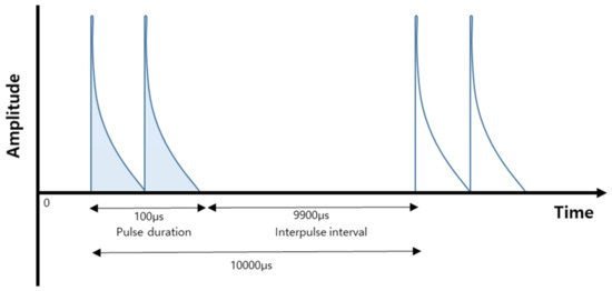 The GV 350 Galvanic High-Volt Pulsed Stimulator (Biomedical Life System, Carlsbad, CA, USA) was used. The MPC is a percutaneous delivery of monophasic pulsed current, twin-peak, pulses with phase duration between 50 and 150μ second (average 100 μ second), which employs voltage up to 500 volts [,]. For accelerating proliferation, it is used the negatively charged cathode to attract fibroblast cells due to polarity selection is based on the healing process the practitioner to facilitate and accelerate proliferation. The therapeutic parameters used in the study included: pulsed current, twin peaked, negative electrode polarity cathode, 100 μ second as frequency, 10,000 μ second for pulse duration, and at sub-motor level amplitude (Figure 1).