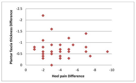 After treatment, the average reduction in heel pain was 3.63 ± 1.98 and the average reduction in the plantar fascia thickness was 0.37 mm ± 0.07 mm. There was no significant correlation between the mean changes in heel pain and the plantar fascia thickness measurement between pre- and post 4-week treatment (r = −0.006, p = 0.97; Figure 2).
