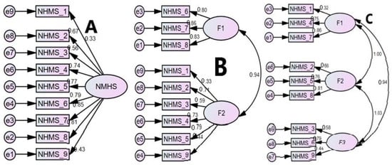 The 3-factor model (model-D; Figure 2) was supported by most of the fit statistics; this model had excellent fit according to GFI (0.95), acceptable fit according to IFI and nearly acceptable fit, as determined by CFI (0.89) (Table 5). The value of the relative fit index of AIC was also least for the 3-factor model (model-D), additionally, the χ2/df demonstrated an ideal range (2.61) (Table 5) [20,25,26].