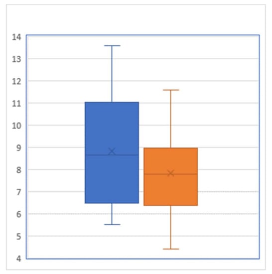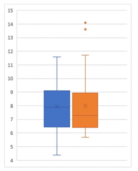 Box-and-whisker plot of hemoglobin A1C level (percent) before (left) and after (right) the intervention (Sample size = 29).