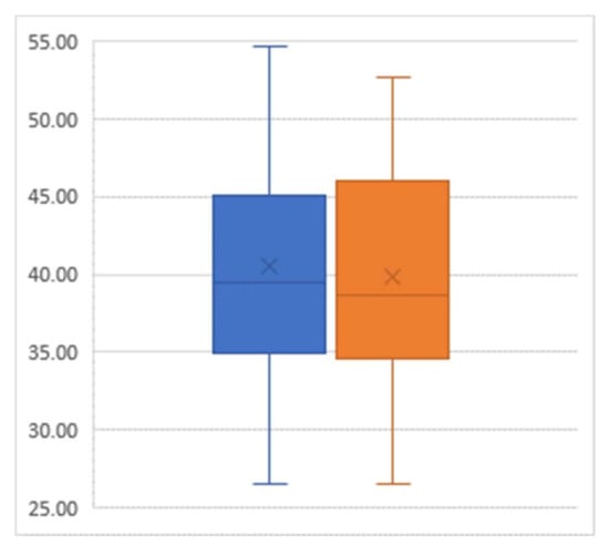 Box-and-whisker plot of body mass index (percent) pre-intervention (left) and post-intervention (right); Sample size = 29.