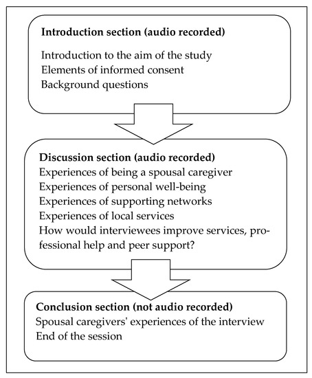 The individual interviews took place in a memory clinic, based in a health center in a town in Eastern Finland during spring 2016. They were conducted and recorded by the same researcher (J.S.). An interview guide was designed, consisting of an introduction, discussion, and conclusion, to help the interviewer take the participants through the process (Figure 1). The text in the introduction was used at the start of the interview, to remind participants of the voluntary nature of the study and that any comments they made would be reported in a way that respected their identity and need for personal confidentiality. The interviewer asked them about their background, such as their age, their spouse’s medical condition, and the support that they provided for them. Five themes were explored during the discussion section. The recorded interviews lasted for 25 to 50 min and after they had ended the participants were encouraged to talk about how they felt about the actual interview (Figure 1). Each interview was adjusted to the pace set by the interviewee.