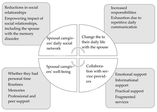 Based on our results, the individual experiences reported by older people caring for a spouse with a memory disorder consisted of their daily social networks and the changes to their daily life with their spouse. They also included collaboration with service providers and their own well-being (Figure 2). We illustrate the results with the original quotes of the interviewees.