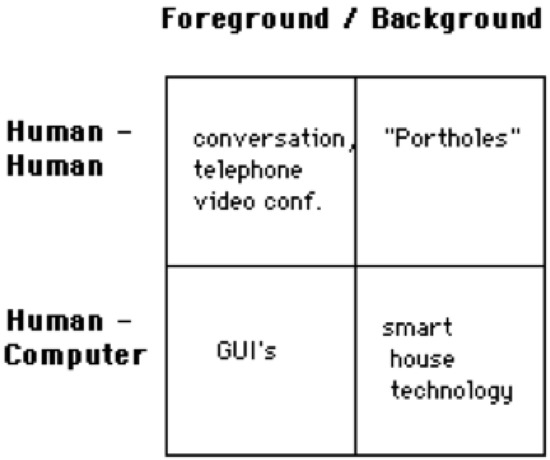 Buxton’s basic framework in 1995 asserted that the subject areas of computing could be placed in categories [19], see Figure 1, incorporating a foreground and background, indicative of conscious and un-conscious tasks. AAL and ADLs systems rely on the technological agility of the user to manipulate interactions implicitly and explicitly, in the foreground when required [20] and otherwise in the background. These interactions ought to be ubiquitous, operating in the background as the user interacts in the foreground. UIs facilitating ease of use and effective Human–Computer Interaction (HCI) result in greater uptake [21,22].