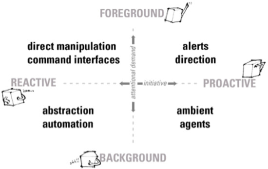 Buxton’s matrix was expanded in 2008 based upon an axis of relevant criteria, see Figure 2, ref. [23] accommodating subtle, implied interactions that occur daily as humans and machines exchange information. Traditional computing can be implicit or explicit, and interactive exchanges are along a continuum that either demand a user’s attention with a command or it responds to a command initiated by the user [24]. AAL systems demand implicit and explicit communications, given users want unobtrusive systems, and achieving this balance of information exchange is the key to success. ADLs visualisation tools need to be in the attentional foreground if required by the user, otherwise to fade into the background. The theory behind Buxton’s original framework and the extended version contends that HCI can be plotted along a continuum of activities counter-balanced against the degree of invasiveness for the user. Critical to UI design emphasis in AAL/ADLs systems is the scales of balance for the user, an interface that assists when requested or when a scenario demands direct intervention is the goal. Systems that acknowledge UI design guidelines and incorporate frameworks have the ability to be truly effective in achieving that balance between user-initiated interactions and random un-requested system intrusions.