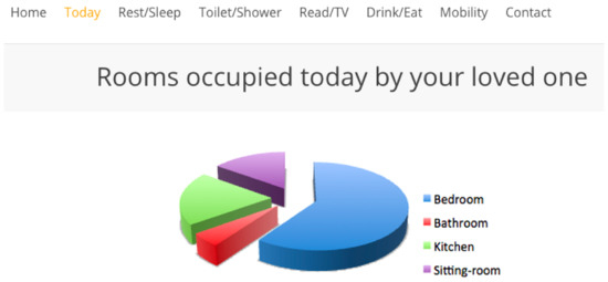 UI research indicates that numerical data, charts or icons are the popular choice for representing activities [51] within a calendar format. Buxton’s theory on foreground/background interactions are demonstrated as activities that comply with normal routine remain in the background, and deviations are brought to the foreground through colour differentiation. Another representation method is a dial or clock format [52] where either a circle or spoke represents data in regularised periods of time, again using colour to highlight areas of interest. Fall detection alerts [53] often via text message sent to the carer/relative provide an elder’s current location using a Uniform Resource Locator (URL) [54,55]. UIs not operating an aggressive alert system may result in falls remaining undetected for extended periods of time [56].
