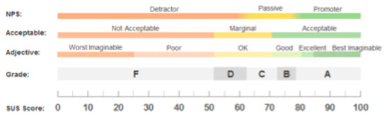 The participants answered the SUS questionnaire on each UI and indicated from 1–5 their level of agreement or disagreement with the sentiment expressed in the question being evaluated. The second review questionnaire had an additional 11 questions included in order to gather demographic information on participants and if they actually understood the information being presented to them in the UIs. The SUS usability questions had a scoring methodology as follows: each odd-numbered question had 1 subtracted from the score and each of the even-numbered questions had their value subtracted from 5. At the end of each questionnaire, the total score was added and multiplied by 2.5. This resulted in a score out of 100, which is not a percentage but a percentile evaluation of system usability. The average SUS score was 68; if the UI score was under 68 there were issues with usability, if above 68 then this was within acceptable limits of usability, see Figure 13.