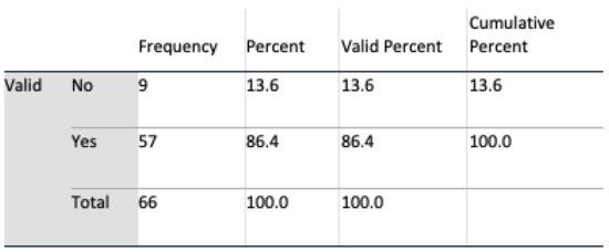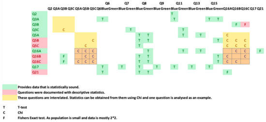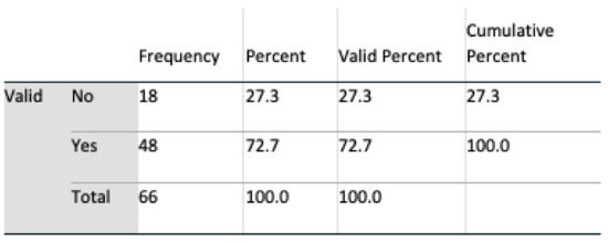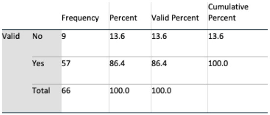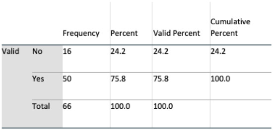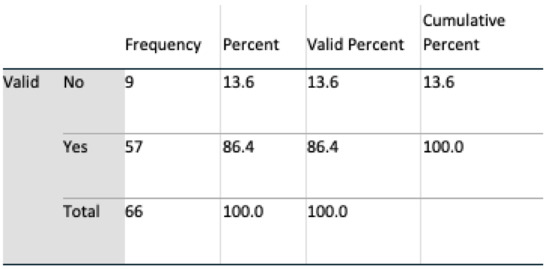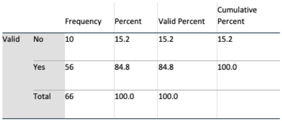 Data analyses were undertaken using SPSS v 24, and multivariate analyses, t-tests, and chi-square tests, including Fisher’s exact test, were all harnessed for interpreting feedback. An initial population of 69 for Q1 and 71 subjects for Q2 completed the questionnaire. During a preliminary screening of the dataset, three in Q1 and five subjects in Q2 omitted to complete the questionnaire satisfactorily. These subjects were removed, resulting in a final valid population of 66 (n = 66) for Q1 and 64 (n = 64) for Q2. Six questions were identified as remaining unanswered in Q2, and these were marked as such in SPSS.