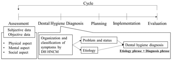 In 1993, the Dental Hygiene Human Needs Conceptual Model (DH HNCM) was theorized as a framework for advancing dental hygiene practice, education, and research []. Originally, the DH HNCM was derived from the Yura and Walsh Human Needs and Nursing Process Theory []. In particular, a series of cycles in the nursing process (assessment, diagnosis, planning, implementation, evaluation) was directly incorporated into the dental hygiene process []. Later, in 2000, Darby and Walsh revised the DH HNCM from 11 to 8 categories of needs (Table 1) []. The DH HNCM provides dental hygienists with a framework for decision making and problem solving in clinical practice and research []. In particular, the DH HNCM plays an important role in dental hygiene assessment and dental hygiene diagnosis in the dental hygiene process of care []. Dental hygiene diagnosis is defined as identifying “real or potential oral health problems and health behaviors that dental hygienists can address in their education and qualifications”. In general, the statement of dental hygiene diagnosis consists of an etiology phrase and a diagnosis phrase (signs and symptoms; Figure 1) [].