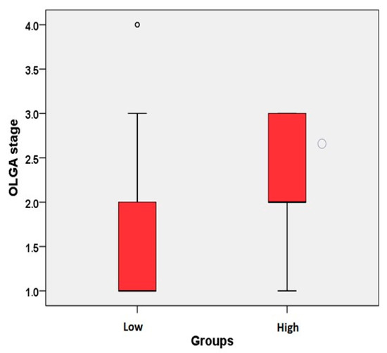 Few patients simultaneously had both high NLR and high NRS values. These patients with both NLR and NRS high value tests were associated with a statistically significant elevated OLGA score with a mean = 2.14, p < 0.007 (Table 4), indicating that these patients had a tendency to have a higher degree of atrophy than those with low-value tests; this may have an impact in predicting patients with premalignant lesions, who are at greater risk of gastric cancer.