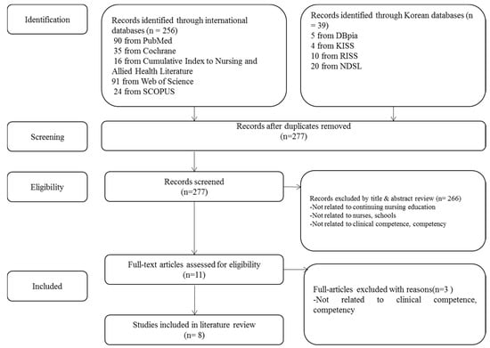 Regarding the competency and continuing education in school nursing, 295 documents (international 256, Korean 39) were searched in the databases. After removing 18 documents that were duplicated, the researcher reviewed 277, based on the title and abstract of the study. The researcher reviewed the title first, reviewed the abstracts for ambiguous papers, and selected 11 articles, except for 266 items that did not meet the criteria. Consequently, after reviewing 11 papers according to the same criteria and process, mainly on the original text, eight items, except for three, were finally selected (Figure 1). Results from a narrative literature review identified six school nurse competency attributes: (1) patient-centered care [6,14,15,16,17]; (2) communication and collaboration [15,16,17,18]; (3) evidence-based practice [16]; (4) school health services and programs [6,14,16,17]; (5) legal and ethical nursing practice [19], and (6) health education [16,17,18]. One study proposed a framework using principles of Quality and Safety Education for Nurses (QSEN) in school nurse continuing education related to child neurology. The framework has six QSEN competency domains: (1) patient-centered care; (2) teamwork and collaboration; (3) evidence-based practice; (4) quality improvement; (5) safety, and (6) informatics [1].