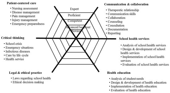 The school nurses play an essential role in coping with a population with a variety of health issues in a school setting [1]. Some surveys identified an average school nurse-to-student ratio as high as 1:1086 in the United States [2], and 1:1000 in the Republic of Korea, respectively [3]. However, the performance of health-related work in school nursing depends largely on the individual competencies of school nurses, precipitating a demand for a systematic education approach to strengthen their competency. The roles or competencies required for school nurses are various and inconsistent [4,5], highlighting the need for the development and implementation of a population-focused definition of roles and competencies. School nurses in the United States are charged with primary, secondary, and tertiary prevention modalities [6]. Through these school nurse-led practices, school nurses contribute to the health and well-being of the students [7] as well as the students’ academic success [8].