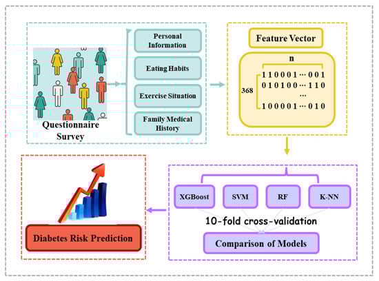 The workflow of this paper is shown in Figure 1. The collected questionnaires were converted into feature vectors in the form of binary codes after strict selection. Meanwhile, the research used 4 machine learning models (XGBoost, SVM, Random Forest (RF) and K-Nearest Neighbor (K-NN)) to conduct experiments, and evaluated the performance of various algorithms through 10-fold cross-validation. Ultimately, we chose the optimal model to predict the risk of type 2 diabetes.