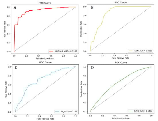 Receiver Operating Characteristics (ROC) curves for each model. (A) is the ROC curve of the XGBoost model; (B) is the ROC curve of the SVM model; (C) is the ROC curve of the RF model; (D) is the ROC curve of the K-NN model.