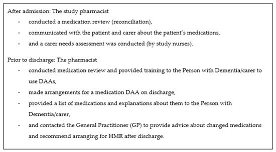 After patient discharge, carers of people with dementia are frequently responsible for managing complex medication regimens and avoiding medication errors, including identifying possible drug interactions, observing for side effects, sometimes making judgements about (withholding, increasing, decreasing, or discontinuing) medications, monitoring changes in prescriptions, and arranging for continuing supplies of medications [17,18]. Furthermore, they may encounter difficulties in this role including coping with regimen complexity, managing PRN (from the latin ‘pro re nata’ meaning ‘as needed’) medications, behavioural and cooperation issues of people with dementia, changes in medications, and understanding the substitution of generic medications, especially in circumstances where there has been a lack of training and support in medication management [6]. Medication complexity has been described as rapidly changing dose and frequency, medications prescribed for multiple conditions, and complicated administration and storage requirements [16]. People with dementia have been reported to be taking an average of 10 medications in hospital [7]. These factors contribute to their burden and stress [17,18]. Some carers may have access to medication dose administration aids (DAAs; such as dosette boxes or blister packs) to assist them to manage medications for people with dementia, and some may have a home medicines review (HMR) provided by a community pharmacist after the person with dementia is discharged. However, previous studies report that although these forms of carer medication management support are desirable [9], they may not be frequently or routinely provided after discharge [19,20].
