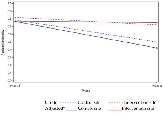 Overall, the use of DAAs after discharge was 72%, and most carers found them to be helpful. Adjusting for carer age, gender, and relationship, there was no significant treatment effect for DAA use at three months after discharge (p = 0.203). See Table 2, Figure 2, and Supplementary Table SE, Additional File S1. There was a significant difference between phase one and two at the control site (p = 0.028); however, this may represent variation over time found by chance (type 1 error), as this is not the intervention site.