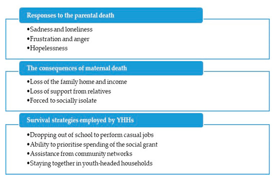 The phenomenological analysis resulted in the identification of three main themes: (1) the response to the parental death, (2) the consequences of the maternal death, and (3) the survival strategies employed by the heads of the households (Figure 1).