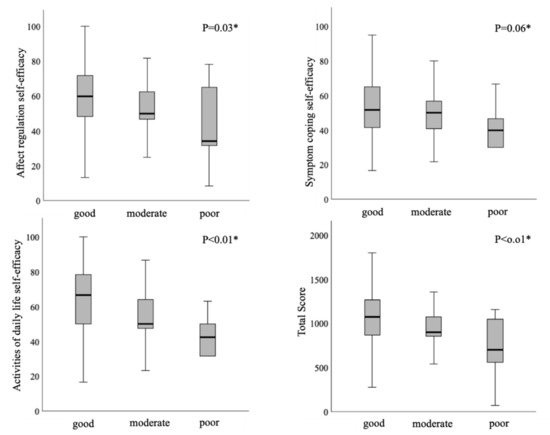 The SEAC is an 18-item scale comprising three subscales: Symptom Coping Self-efficacy (SCE), Activities of Daily Living Self-efficacy (ADE), and Affect Regulation Self-efficacy (ARE). Each subscale includes six items on an 11-point response scale, ranging from zero (not at all confident) to 5 (50% confident) to 10 (totally confident). The final subscale scores were calculated by summing the scores of each subscale.
