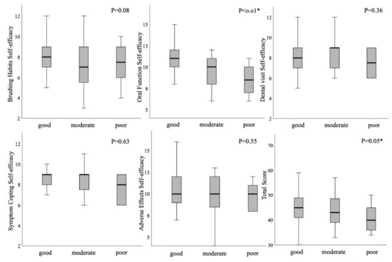 The OSEC is a 17-item scale comprising five subscales: Oral Function Self-efficacy (OFE) (four items), Dental Visit Self-efficacy (DVE) (three items), Adverse Effects Self-efficacy (AEE) (four items), Symptom Coping Self-efficacy (SCE) (three items), and Brushing Habits Self-efficacy (BHE) (three items). Response options are on a four-point Likert scale from 1 (not at all confident) to 4 (totally confident). The scores on the individual items within subscales were summed to obtain total subscale scores [26].