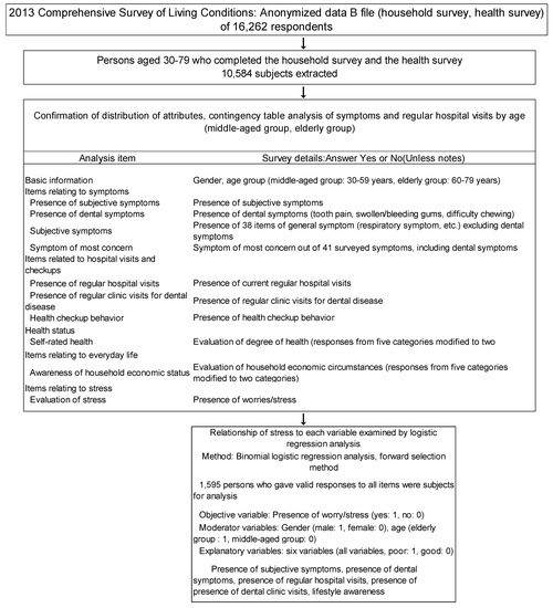 Anonymized data sheets of the questionnaires (household survey, health survey, in Japanese) from the 2013 Comprehensive Survey of Living Conditions were obtained following the Ministry of Health, Labour and Welfare’s access to data process. The data from 10,584 individuals in the 30–79 age group (5092 men, 5492 women) were used for the analysis. The subjects were limited to people aged 30 or over because the Survey of Dental Diseases conducted at the same time found this to be the period during which the proportion of people with missing teeth increases, and also the government considers this to be the target age group for health checkups and health guidance. The subjects were grouped into two age groups: the middle-aged group (30–59 years) and the elderly group (60–79 years).