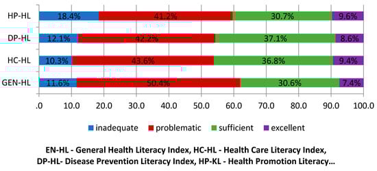 According to authors of the HLS-EU-Q47 [,], the scores for general HL, health care HL, disease prevention HL, and health promotion HL were categorised into ‘inadequate HL’: score 0–25, ‘problematic HL’: score 25.01–33, ‘sufficient HL’: score 33.01–42, and ‘excellent HL’: score 42.01–50.