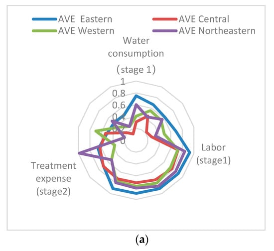 - Water pollution shows a significant association with regional water diseases like arsenic poisoning and fluorosis. Compared with previous studies by Chen et al. [40] and Wang and Yang [19], this research further explores the regional differences between wastewater pollution and health. The efficiency of water disease prevention and control in all four regions of China shows a downward trend, and the severe situation of water disease control in the northeast indicates that China’s wastewater pollution and water disease control have not been optimistic in recent years, and thus measures are needed for improvement.