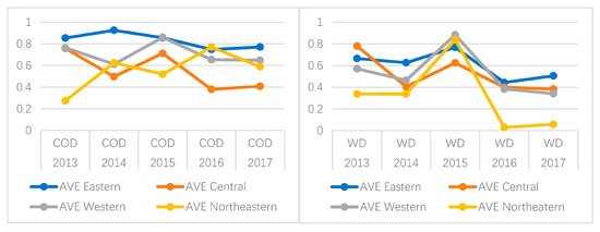 - The efficiencies of prevention and control of water diseases in all four regions are declining. There is a close relationship between COD and water disease efficiency. In the central and western regions, there is a positive correlation between the two scores. However, the effect of COD efficiency on water health efficiency in the eastern and northeastern regions is limited. The eastern region should therefore pay more attention to the control of COD content and improve the requirements of corresponding indicators, so as to reduce the number of water pollution diseases and achieve the goal of improving the overall efficiency.