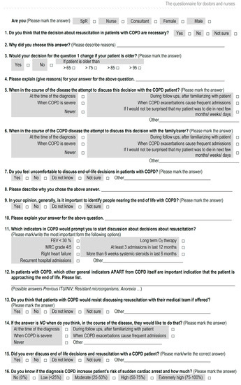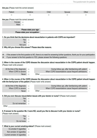 This study was conducted in the Department of Pulmonology, University Hospital Center Osijek, Croatia, between February 2018 and October 2018. The study was designed as a cross-sectional study. There were two groups of participants, namely, patients with established diagnoses of COPD and their HPs. The Global Initiative for Obstructive Lung Disease (GOLD) system categorizes airflow limitation severity in COPD into stages (based on the post-bronchodilator forced expiratory volume over 1 s), with the mildest form being stage 1 and the very severe form being stage 4 [17]. Patients with COPD who were included in the study were diagnosed with stage 3. Ethical approval was granted by the Ethical Committee of University Hospital Center Osijek (at its session no. R2-4718/2018, held on 29 May 2018). Participants were asked by the investigator (first author) about their willingness to participate in the research and were handed an information leaflet and a self-administered questionnaire. The patients eligible for the study had a diagnosis of COPD, were at least 65 years old, and gave verbal consent for participation in the study. The exclusion criteria for patients with COPD were: (1) younger than 65 years; (2) the inability to read, write, and communicate; (3) a score of less than 6 in the abbreviated mental test score (AMTS); (4) patients with a GOLD stage other than stage 3 at the time of the study initiation; and (5) patients who did not provide verbal consent to participate. Patients were asked to complete a self-administrated questionnaire (Figure 1) that contained various questions relating to their previous experience about EOLC communication with HPs related to COPD and future wishes related to such conversations. The topic of resuscitation was chosen in this questionnaire as a representative and illustrative part within EOLC that allowed the patient to realize the complex issue as vividly as possible. Before joining the research, the AMTS was carried out on all patients [18]. Those who had a score less than 6 were not included in the study, and the remaining patients and HPs received an information leaflet in which the goal, purpose, and benefit of this research were explained. The nature and type of the questions and the topic to be discussed in the questionnaire were explained. It was stated that there was no risk of a breach of confidentiality. Participation was voluntary, anonymous, and the questionnaire was completed only once. The ethical committee approved verbal consent as an alternative to the written form because this research involved a minimal risk for all participants.
