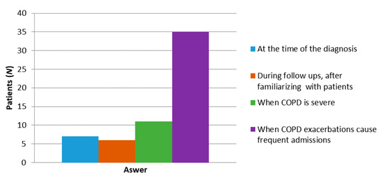Our study identified that two-thirds of interviewed patients believed that the EOLC is important, and most of them thought that the best time for this conversation is during frequent hospital admissions, similar to the findings in other studies [25,26]. In our study, most HPs anticipated an advanced stage of the disease in the form of right heart failure, recurrent hospital admissions, and LTOT as the “patient’s ideal timing” for such a conversation. Interestingly, neither the patients nor the HPs suggested that such discussions should take place at an early stage of the disease [27].