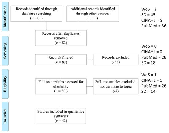 Reviewers queried four databases: The Cumulative Index of Nursing and Allied Health Literature (CINAHL), PubMed (MEDLINE), Web of Science, and Embase (Science Direct). Databases were filtered for the last 10 years. Database searches occurred between 1–15 February 2020.