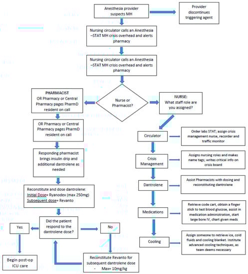 An “anesthesia stat-MH crisis” is called out over the intercom to alert operating room (OR) staff including anesthesiologists, nurses and pharmacists to respond and assist in treating the patient. The anesthesiologist will serve as the primary leader for the resuscitation response and ensure that all aspects of patient care are accounted for. The primary OR nurse will retrieve the MH cart (contents shown in