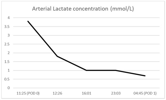 In the ICU, the patient continued to receive Revonto 80 mg (~1 mg/kg) IV Q 6 h for 24 h. During this time period, the patient’s lactate fell from 3.2 mmol/L at its peak to 0.6 mmol/L (