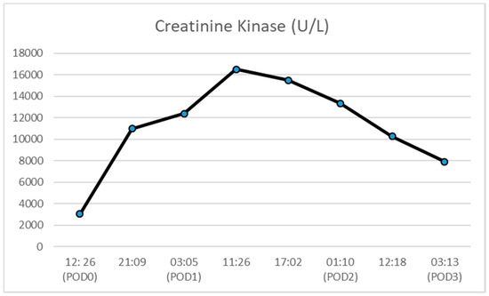 Figure 2). His creatinine kinase (CK) peaked at 16,505 units/L and decreased to 7887 units/L prior to discharge (