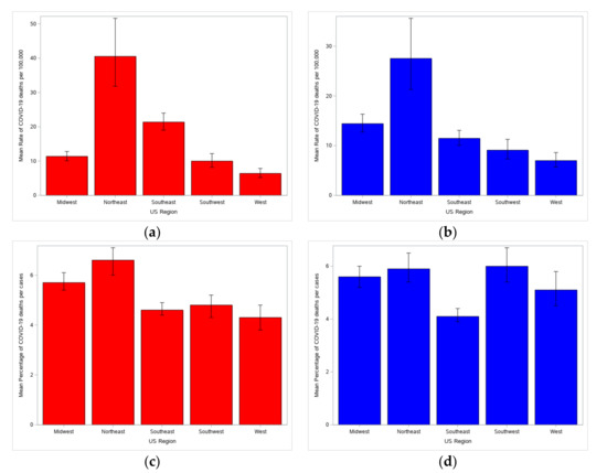 Population mortality rates were significantly different by region for both null (Figure 1a) and full (Figure 1b) models. The Northeast had a significantly higher rate than all other regions and the Midwest had a significantly higher rate than the Southwest and West. This pattern was expected given the prevalence of coronavirus infections in East Coast states. Case fatality rates were also significant by region for both null (Figure 1c) and full (Figure 1d) models. The Southeast had a significantly lower rate than other regions.