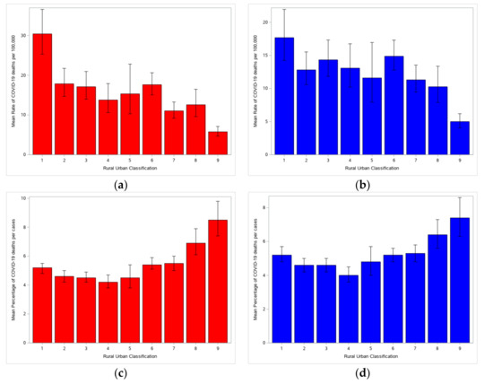 Differences in rate by rural-urban designation (1 = most urban, 9 = most rural). (a) Mean death rate per 100,000 for the rural-urban-only model. (b) Mean death rate per 100,000 for full model (including confounding factors). (c) Mean percentage of deaths per cases for rural-urban-only model. (d) Mean percentage of deaths per cases for full model (including confounding factors).