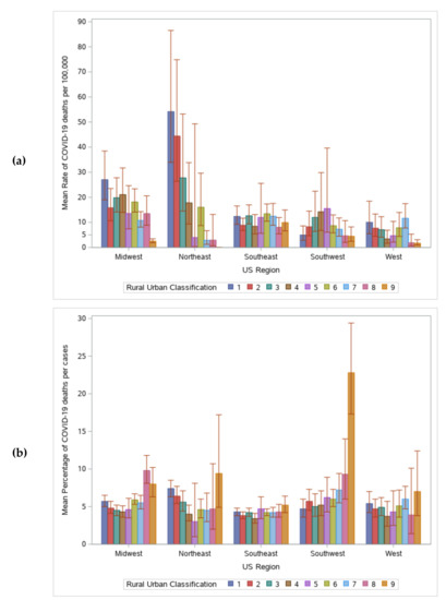 Differences in rates by the interaction between region and rural-urban designation (1 = most urban, 9 = most rural). Models included confounding factors. (a) Mean death rate per 100,000. (b) Mean percentage of deaths per cases.