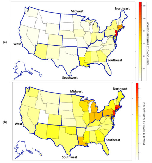 State and Region maps. (a) Mean COVID-19 mortality rate per 100,000. (b) Mean Percentage of COVID-19 deaths per case. Values were calculated by averaging county-level rates across each state. Alaska and Hawaii are part of in the Western region and were moved and scaled to fit.