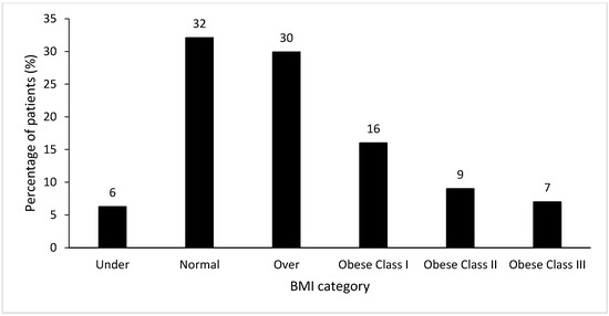 There was a significant difference between sites for age (p < 0.01) and sex (p = 0.04), but not BMI (p = 0.17). Figure 1 illustrates the prevalence of BMI categories within the combined inpatient cohort, with 30% (n = 397) classified as overweight and 32% (n = 421) classified as obese, including 7% of patients (n = 93) with a BMI > 40.00 kg/m2. There was no difference in prevalence of BMI categories between sites (Table 1). Eight percent (n = 83) were identified as underweight across all sites. These patients were not studied further in this research as it was outside the scope of the study.
