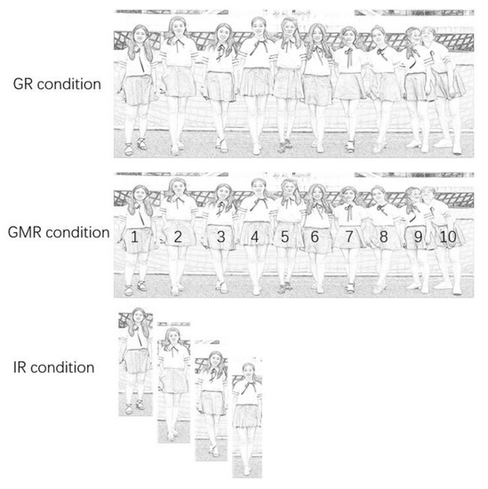 The photo stimuli were provided by 75 university students who were active in the online public social network platform named Wechat. In order to ensure the diversity of appearance, features such as varied gender, with or without glasses, hair length, and different facial expressions were considered in the selection criteria, and they were chosen with relatively high, medium, and low attractiveness (pilot tests of one-way ANOVA with attractiveness factor at high, medium, and low levels) with significant difference (all ps < 0.05) among each comparison of the attractiveness. The photo stimuli were assigned into three groups which represented three different rating conditions. Specifically, in the GR condition, several individuals appeared together in one photo stimuli in order to be rated as a whole group; in the GMR condition, several individuals’ appearances synthesized together in a single photo stimulus with their corresponding Arabic number for indication (see Figure 1); and in the IR condition, where each individual was presented in a single photo stimulus.